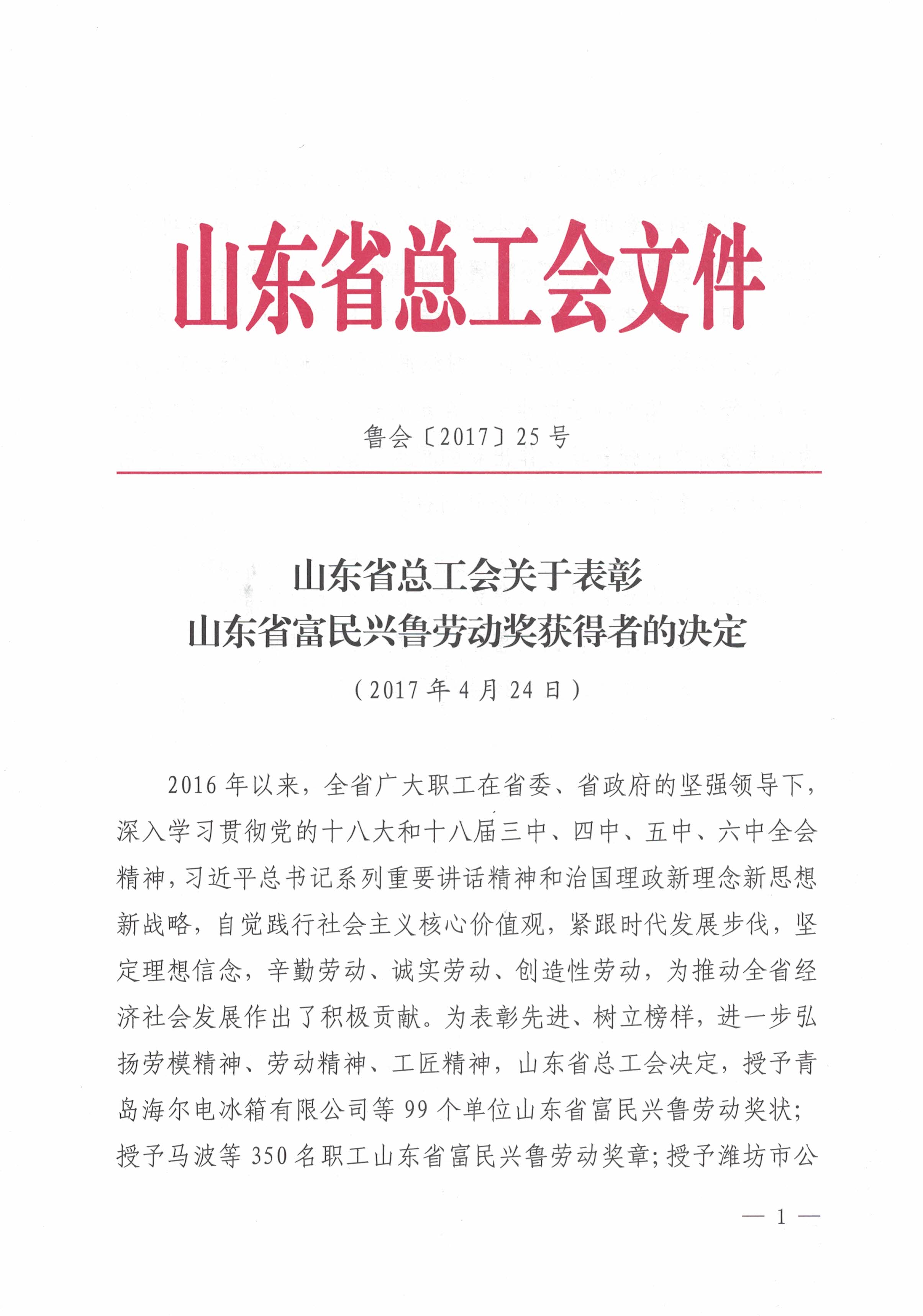 據(jù)了解,“富民興魯勞動獎狀”是山東省總工會組織評選的先進集體獎項,旨在激發(fā)各單位自覺踐行社會主義核心價值觀,緊跟時代發(fā)展步伐,堅定理想信念,辛勤勞動、誠實勞動、創(chuàng)造性勞動,為推動全省經(jīng)濟社會發(fā)展作出積極貢獻,最終為實現(xiàn)“十三五”規(guī)劃目標(biāo)任務(wù)和全面建成小康社會建功立業(yè)。